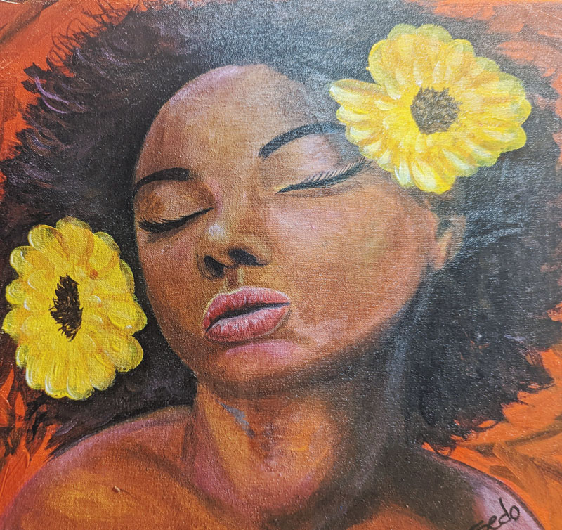 Beautiful 12″ x 12″ original painting of a woman with sunflowers in her hair