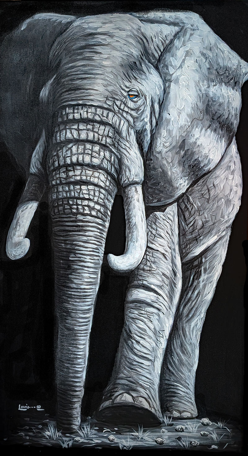 Stunning 20″x 35″ original painting of a Black and White lone elephant